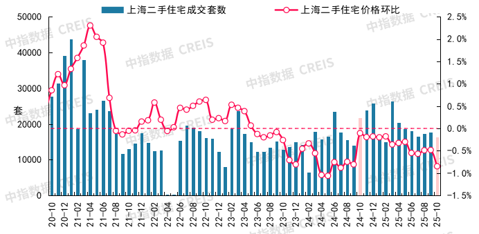 深圳二手室第价钱环比下跌0.63%,《看法》正在新型城镇化部门再次强调要“鼎力实施城市更新”,图:2020年10月至2025年10月上海二手室第成交套数及二手室第价钱环比走势