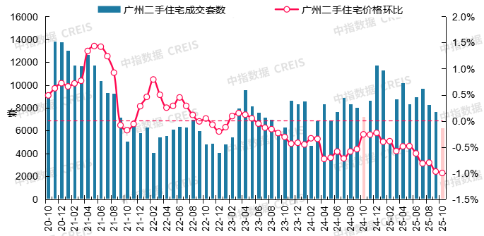 图:2020年10月至2025年10月广州二手室第成交套数及二手室第价钱环比走势